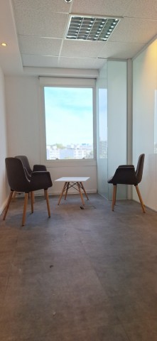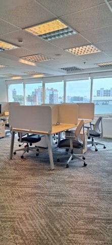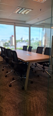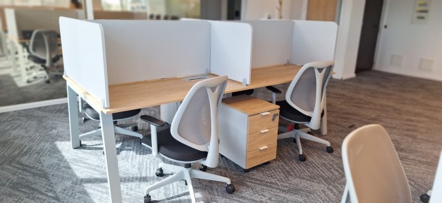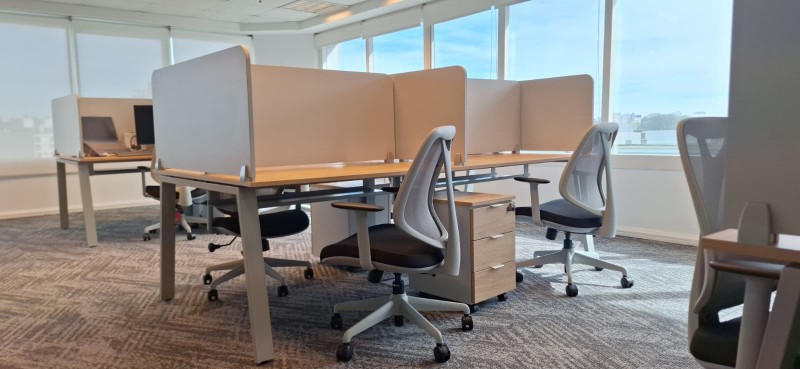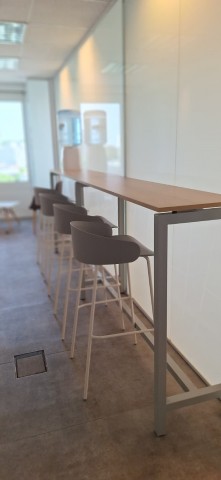 Con islas línea Lean con divisorias, mesa de reuniones también Lean con bases metálicas y tapas en imitación madera.