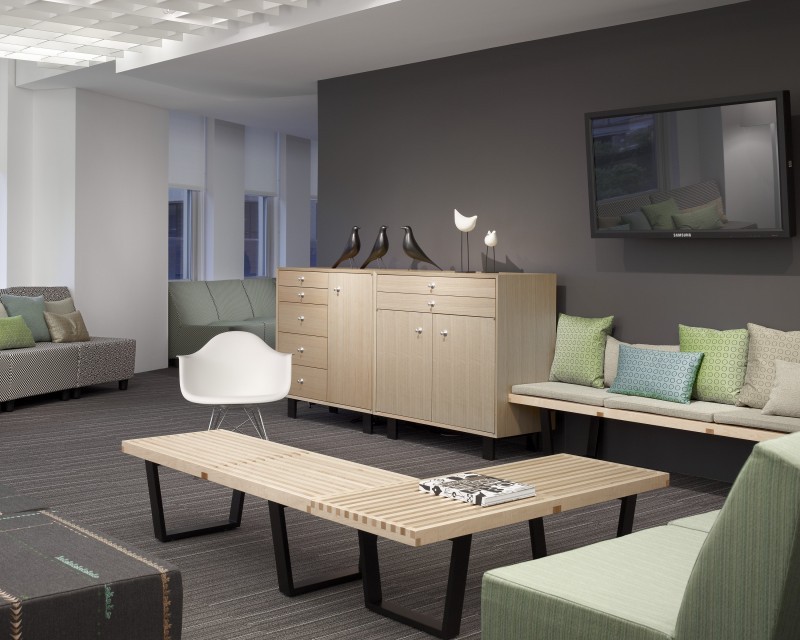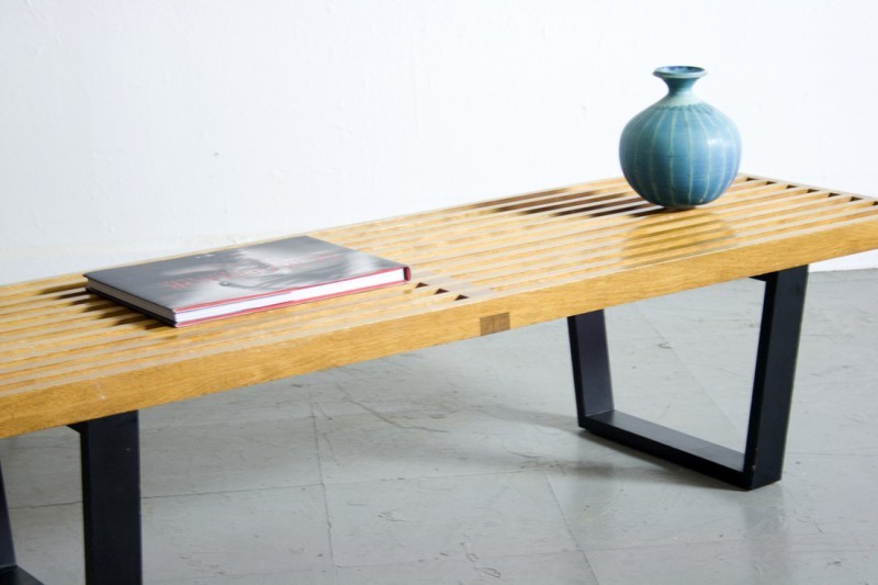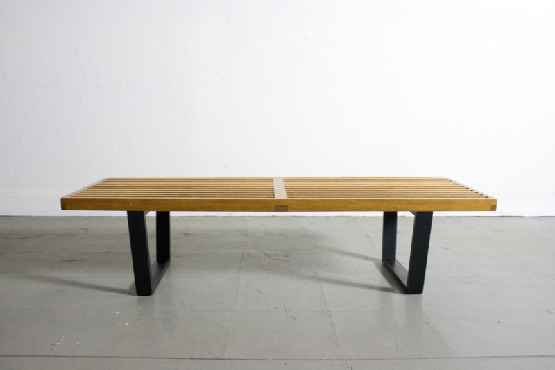 Diseñado en 1946. La expresión de la forma claramente rectilínea de este banco refleja el trasfondo arquitectónico de George Nelson. Como muchos clásicos del diseño, se puede emplear de manera flexible y variable como banco o mesa para colocar objetos. Terminaciones: roble macizo y bases metálicas con pintura texturada.