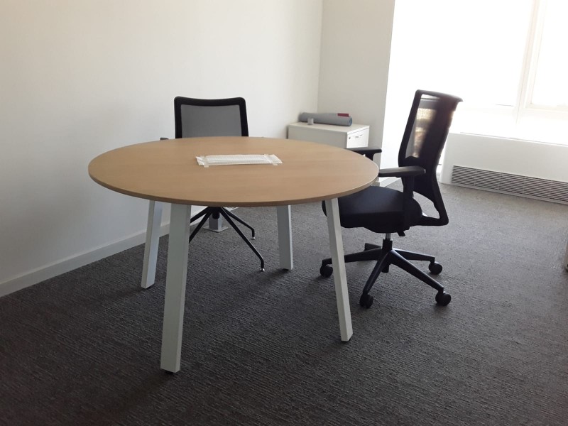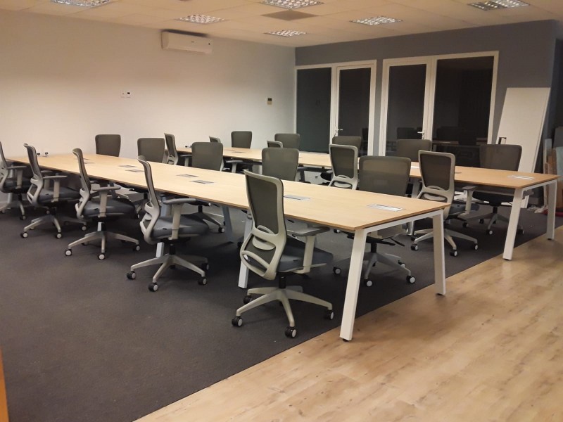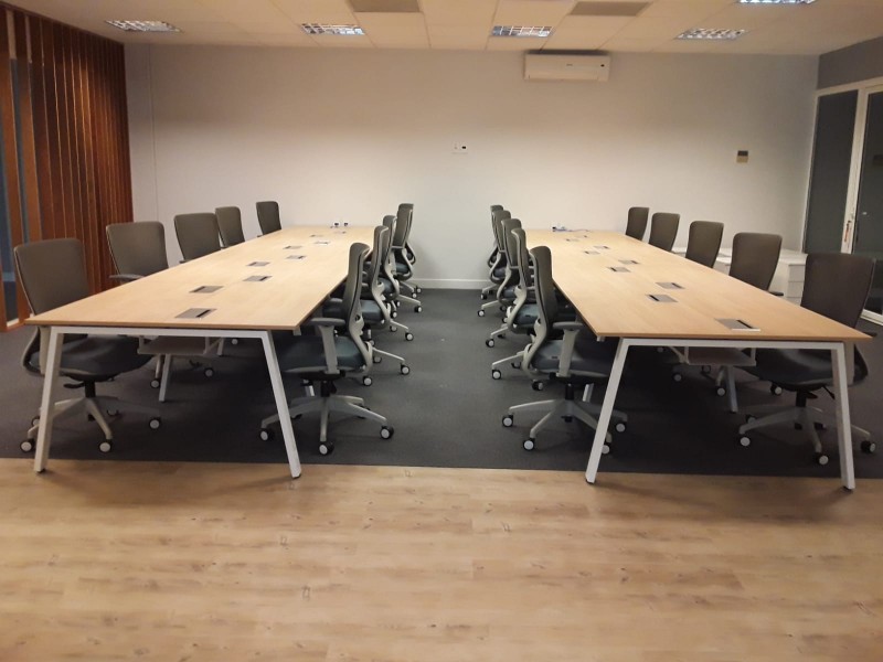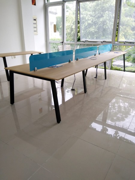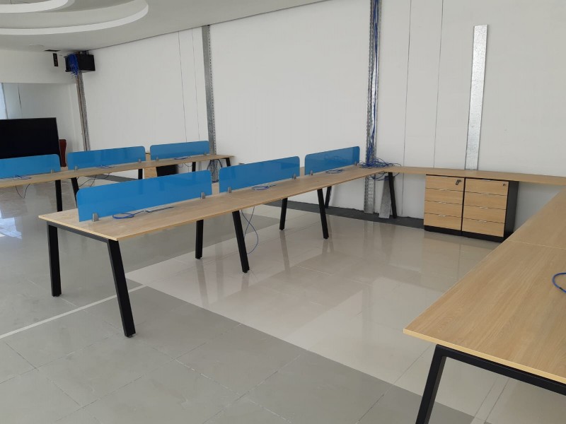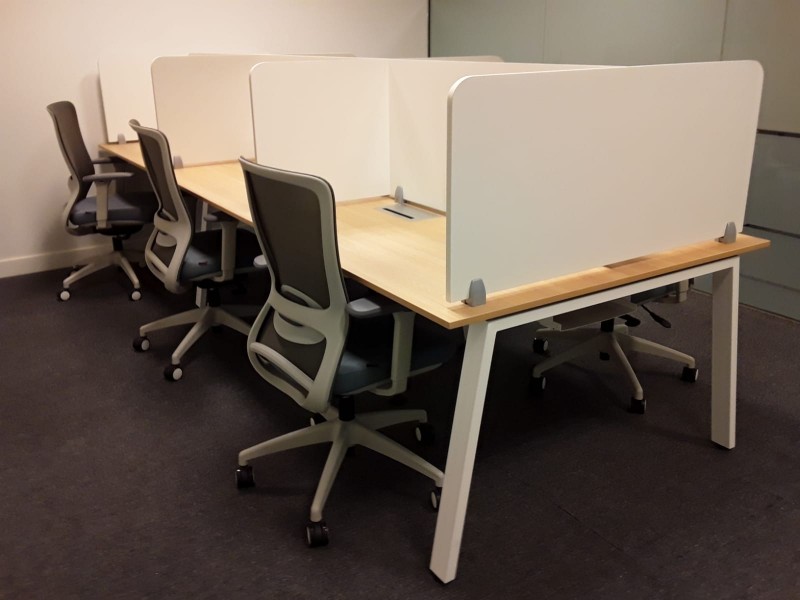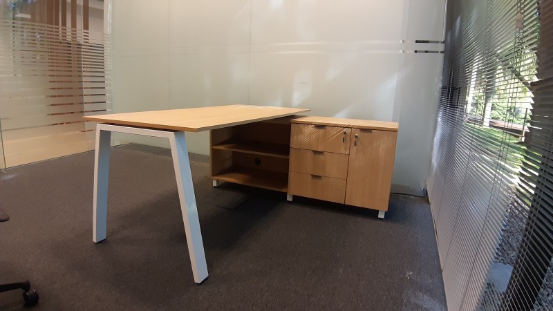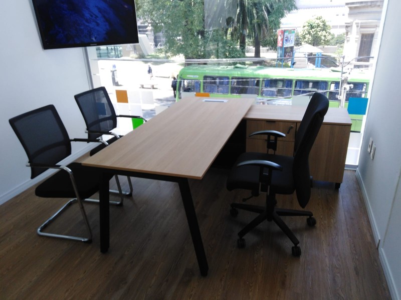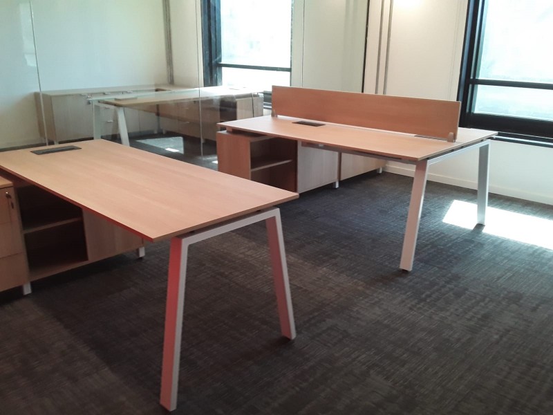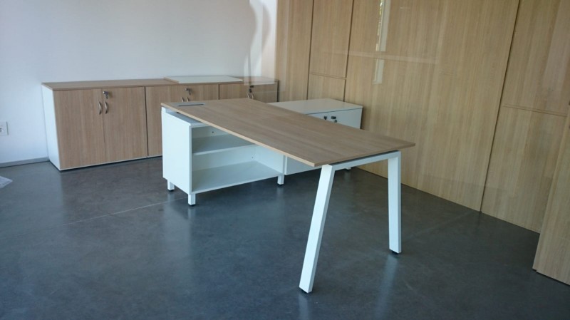 Línea operativa/ejecutiva de escritorios con bases metálicas anguladas. Tapas en placas melamínicas con bordes ABS de 2mm de espesor. Cajoneras y muebles de almacenaje complementarios. Medidas standard y medidas especiales. Combinación de colores a elección.