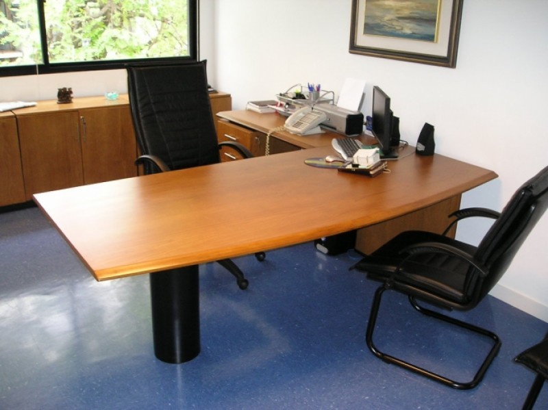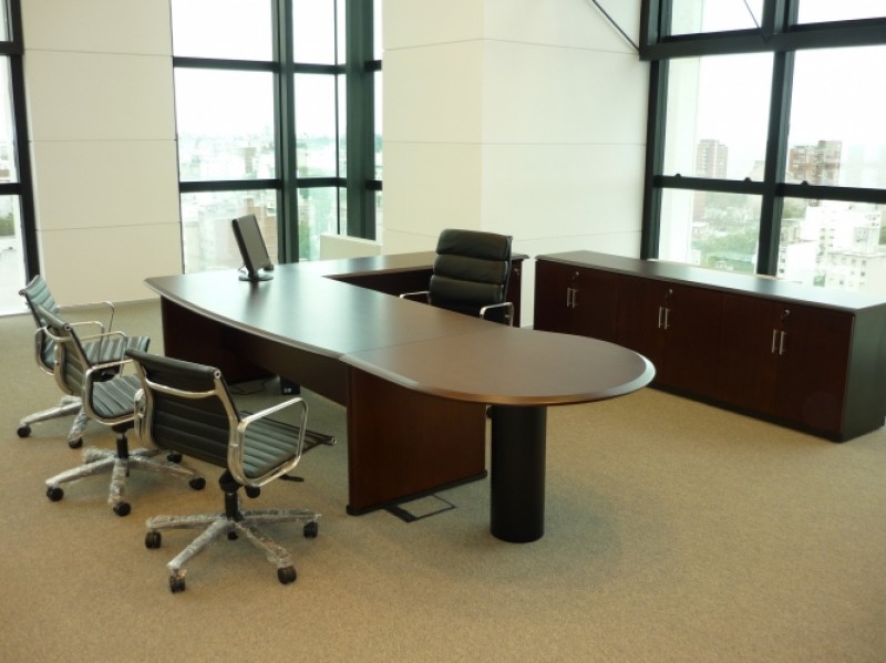 Chicago | Línea Gerencial/Direccional de escritorios. Tapa y base en MDF laminado en Madera lustre color a elección, con canto trompeado, e= 28mm Cajoneras íntegramente laminados en Madera, archivadores con techo y frentes en madera, exterior en melamínico.